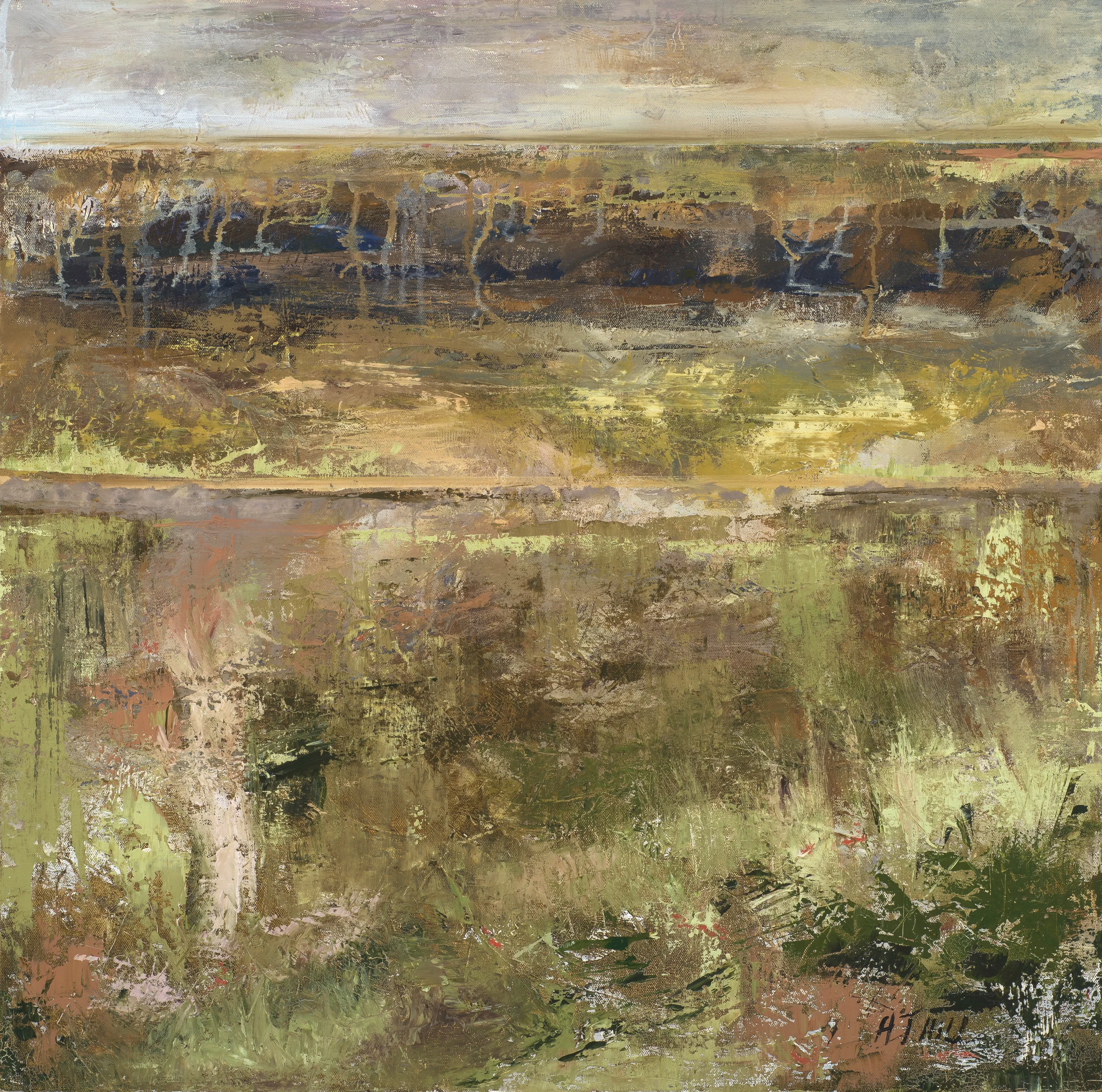 Fog takes a deep dive into the world of fading flora. As the dulled light and misty sky pretend to be dusk, all color appears to recede. Yet this painting is actually heavy with color.